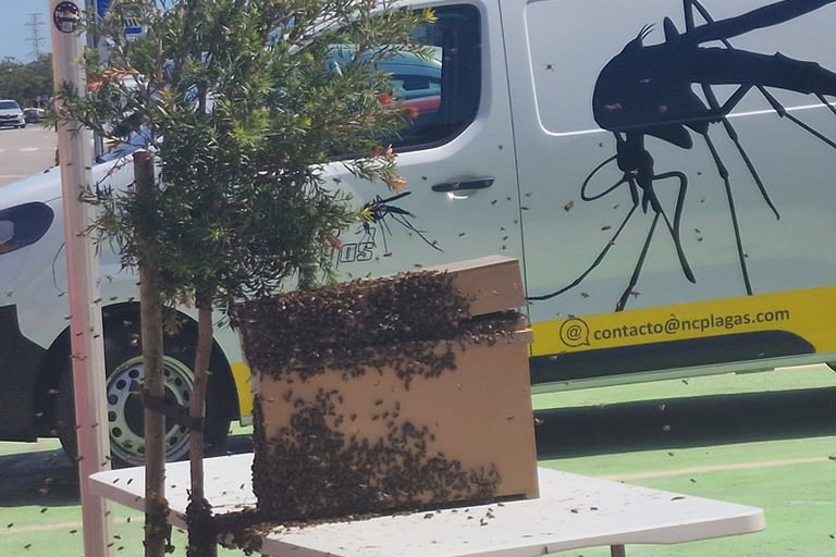“¿Has visto un grupo de abejas agrupadas en tu fachada o jardín? Tranquilo, puede ser un enjambre en tránsito. En NC Plagas realizamos retirada segura y sin daño para las abejas, reubicándolas con profesionales apícolas. Actuamos rápido para evitar riesgos. ¡Consúltanos!”